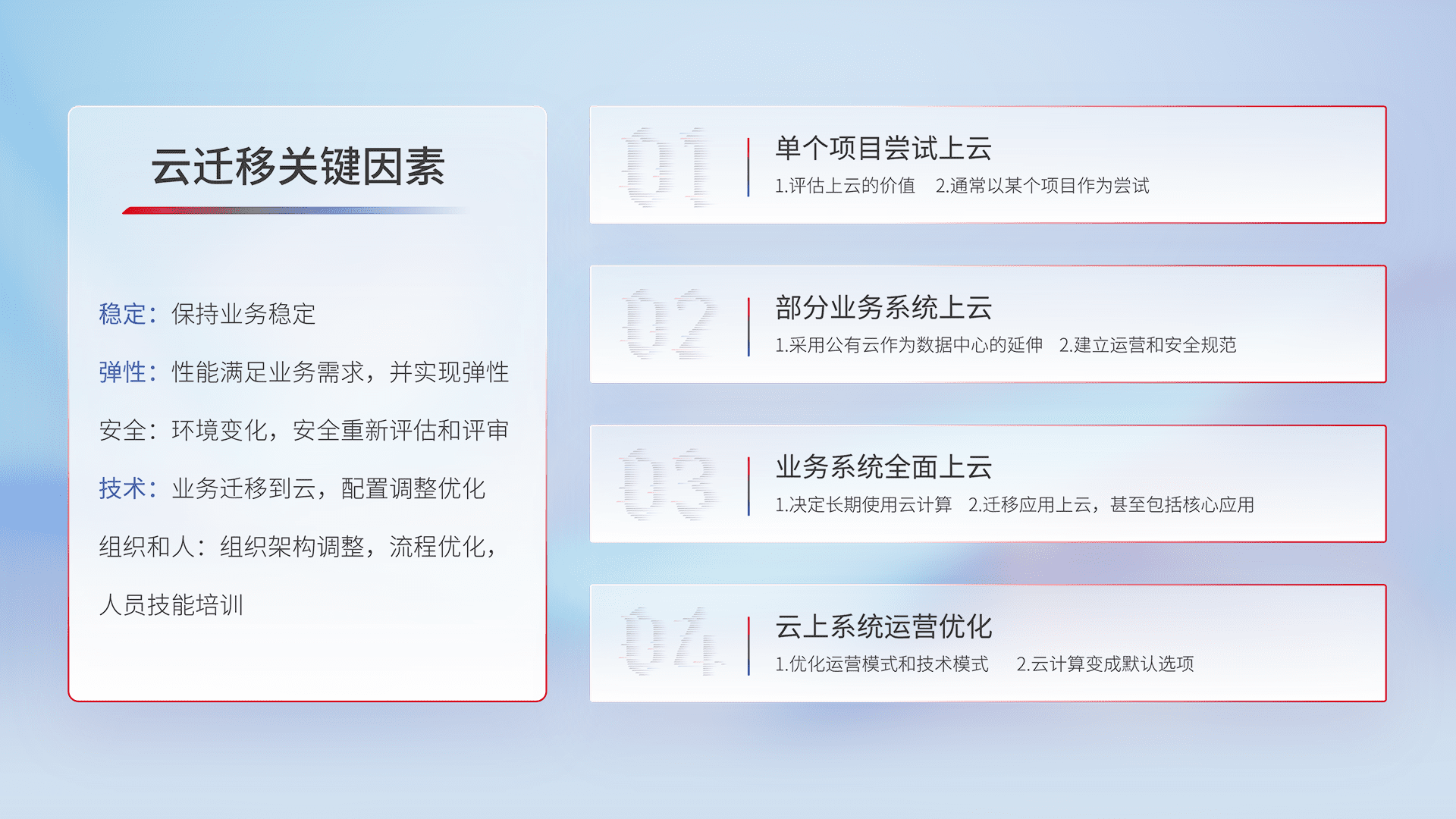 结合实际业务,,,从规划设计、、、、云平台选型、、、、云原生改造、、数据迁移、、集成交付,,,,迁移全过程为客户识别最佳上云路径,,,做好风险识别管理,,设计网络架构、、、身份权限、、、安全审计合规、、操作审计、、、日志审计、、、、监控告警策略、、多站点容灾设计等,,对云上基础设施进行整体规划,,提升IT治理水平,,以满足弹性、、、高可用、、、、高性能的需求。。。。