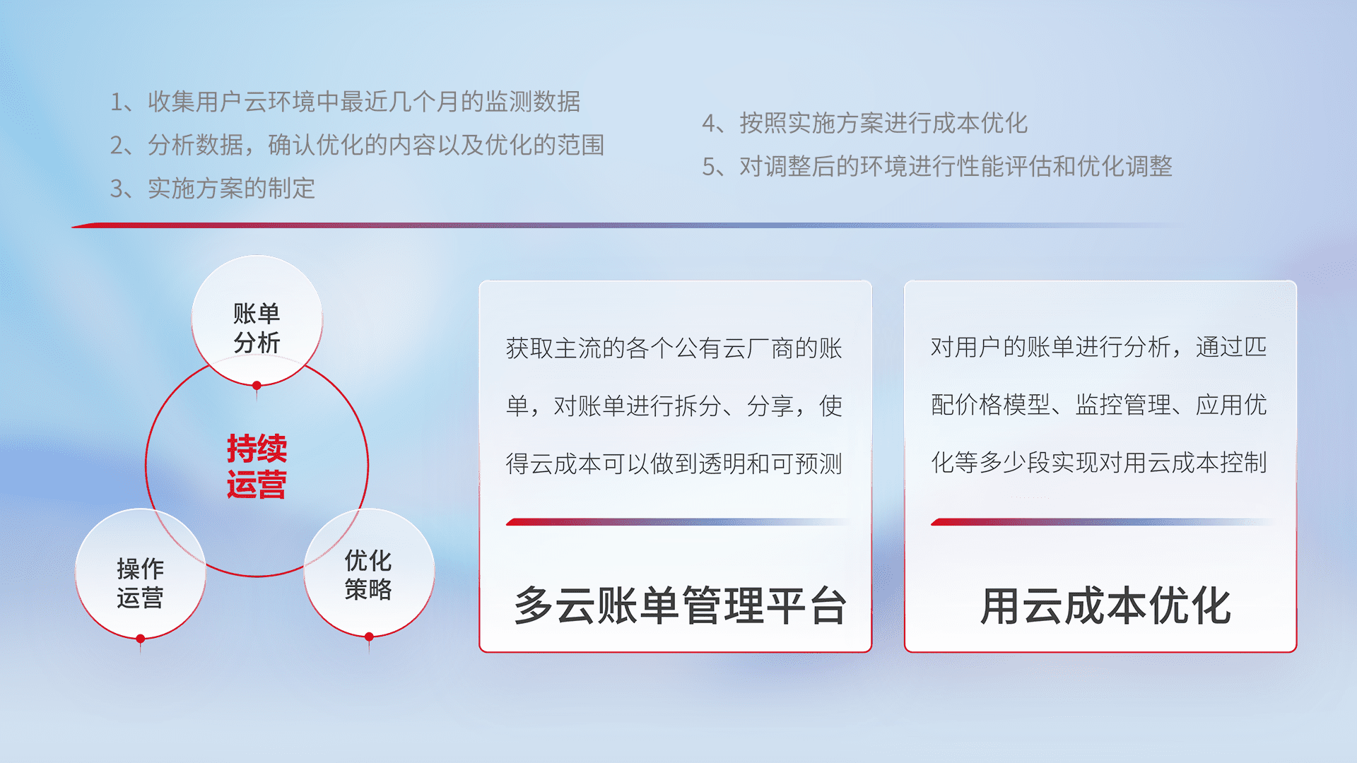 通过多云纳管,,,以统一的资源数据模型把客户的云资源进行抽象和封装,,进而实现对多云资源的统一操作,,保障云资源管理的可靠性、、稳定性与可用性。。。量身定制化运维内容,,,配置、、、、开发运维、、补丁管理、、、备份、、、、监控、、认证和访问管理、、审计和日常巡检等,,,,保障在用云过程中的可靠度,,,稳定度以及高可用率。。。